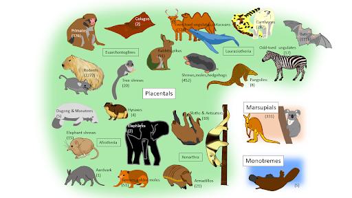 Tips:多数哺乳动物是全身被毛、运动快速、恒温胎生、体内有膈的脊椎动物,是脊椎动物中躯体结构的动物类群,因能通过乳腺分泌乳汁来给幼体哺乳而得名。