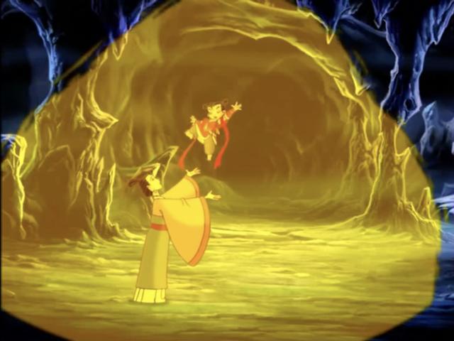 在《哪吒传奇》的尾声中,哪吒打死了石矶,却被石矶的残存黑暗能量附了身,心智混乱,变得暴躁无常,遁入无明的境地中,母亲进入黑暗之谷,牵着哪吒说:“心里想着光明,你就能冲出去,妈妈会为你照亮出去的路。”