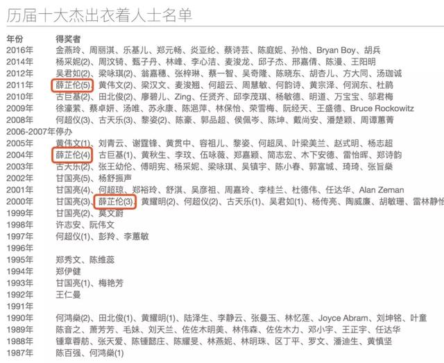 ▲十大杰出衣着人士颁奖典礼由香港时装设计师协会于1978年创办。其主要目的是表扬各地一众独具触觉的时尚名人,以及积极推动时装发展的业界人士。此图出自维基百科列出的历年着装最佳人士名单,名单略有遗漏。
