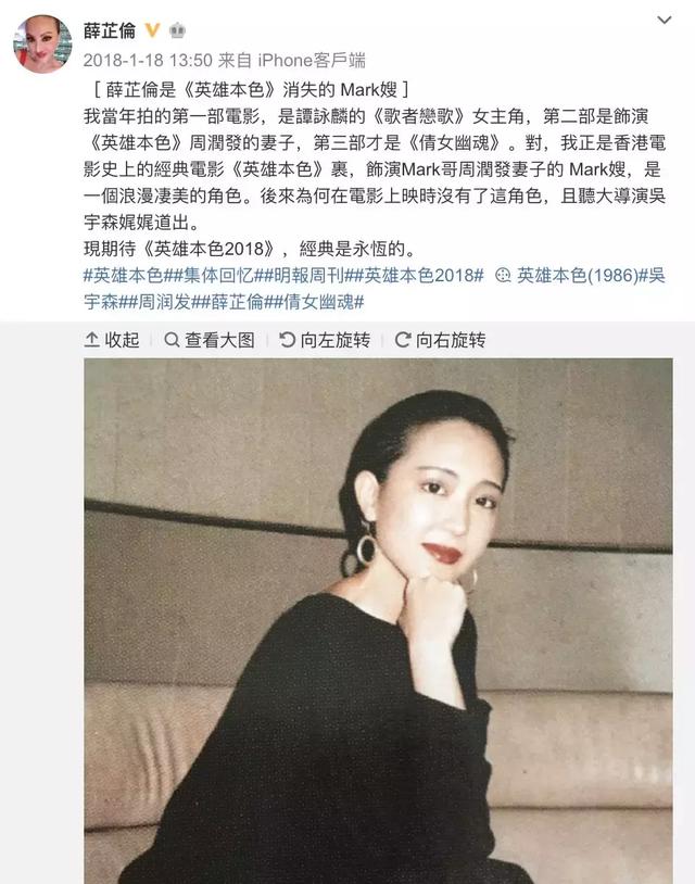 她与周润发也合作过多次,《英雄本色》里消失的mark嫂正是薛芷伦。