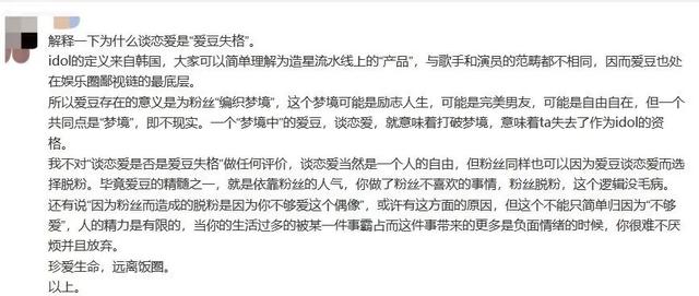 “如果说没有好音乐,演技差还可以用偶像光环掩盖,那么谈恋爱就真的是一名偶像的失格。”