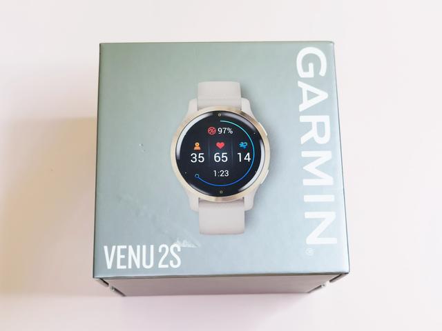 Garmin Venu 2S腕表使用了简约的外包装,正面清晰地展示了腕表的正面照,右侧直观呈现了Garmin佳明的品牌Logo,底部是产品名“Venu 2S”,灰色低调但又大气、从容。
