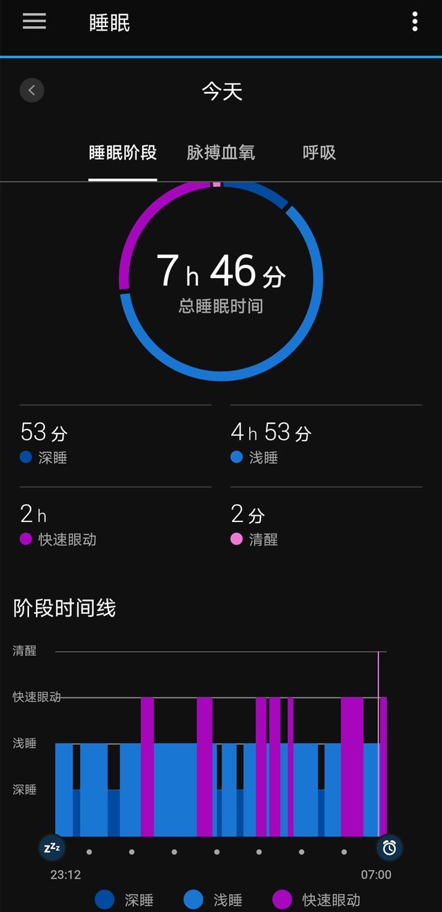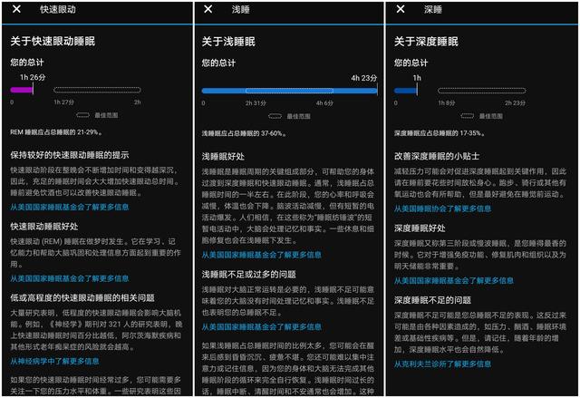 在你睡觉的过程中,你的睡眠分数就自动生成了。睡眠分数由睡眠时间、压力、深睡、浅睡、快速眼动、清醒时间及不安等因素组成,并且每一项都有详细的分析,可以帮助我们改善睡眠质量。