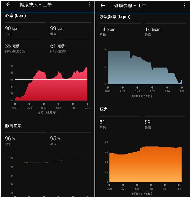 只需要等待2分钟,我的健康快报像呼吸频率、压力、心率、脉搏血氧等数据就一一呈现啦~