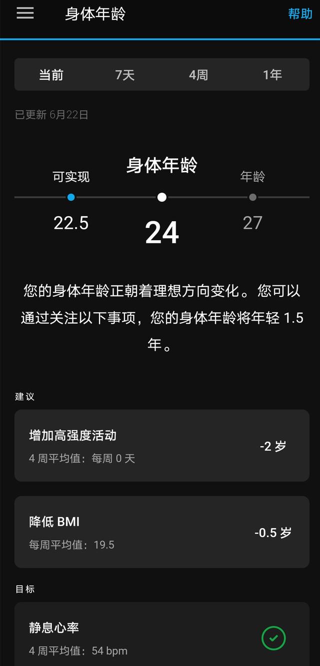婉儿实际年龄27岁,用多个软件测试过,身体年龄都是24,虽然年龄只是一个数字,但是可以通过运动及调整生活方式等的努力,达成目标的身体年龄。婉儿相信,有了Venu 2S目标年龄早晚会成现实。