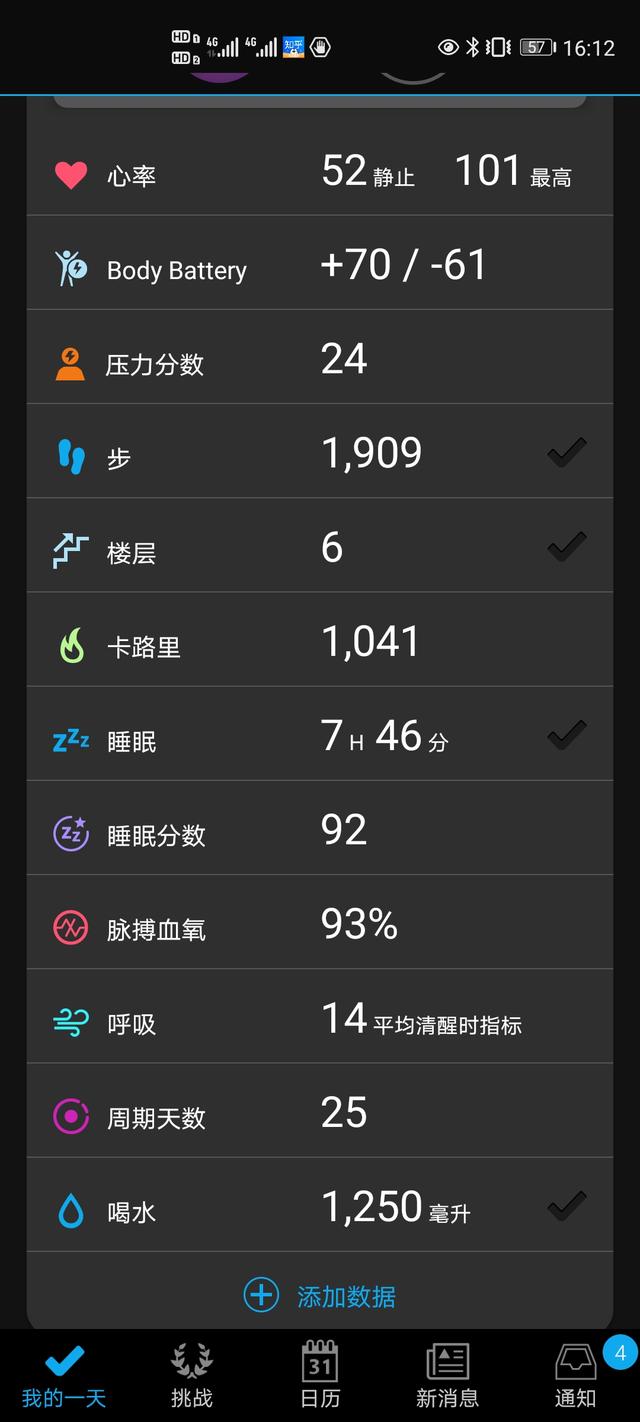 进入到App首页,可以看到所有的功能被分为了我的一天、挑战、日历、新消息、通知,这5个大部分。其中在默认“我的一天”页面里,是一整屏与腕表同步后的各种实时数据卡片,包括有心率、身体电量、压力、步数、睡眠、呼吸、喝水等全天候数据记录。