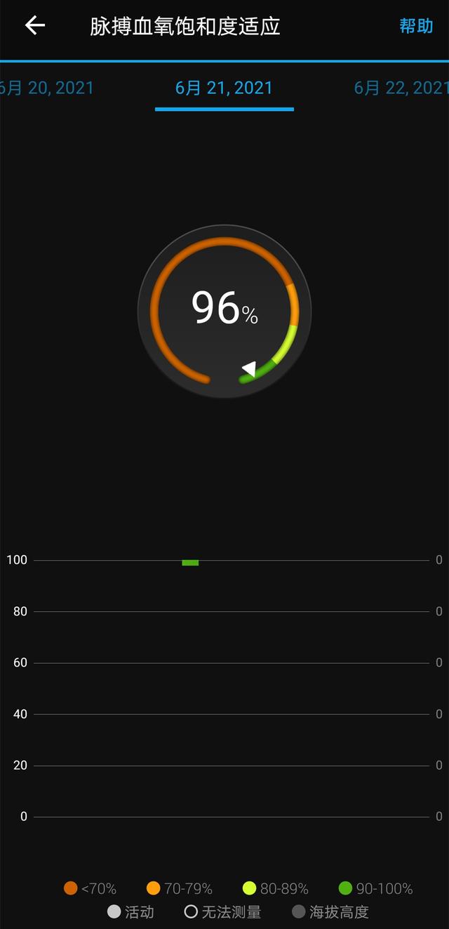血氧饱和度是呼吸循环的重要生理参数,能够反映出人体呼吸系统以及心血管的健康程度。只要带上Venu 2S,不到一分钟,我的血氧饱参考值就计算出来了,它可以帮助我及时了解血液中的氧含量。