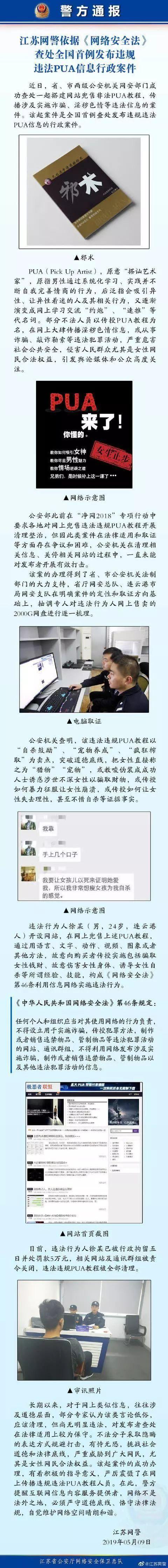 2019年5月,江苏网警也成功查处一起搭建网站兜售非法PUA教程,传播涉及实施诈骗、淫秽色情等违法信息的案件。违法行为人徐某被处以行政拘留5日,并处罚款5万元,相关网站及通讯群组被责令关闭,违法违规PUA教程被全部清理。