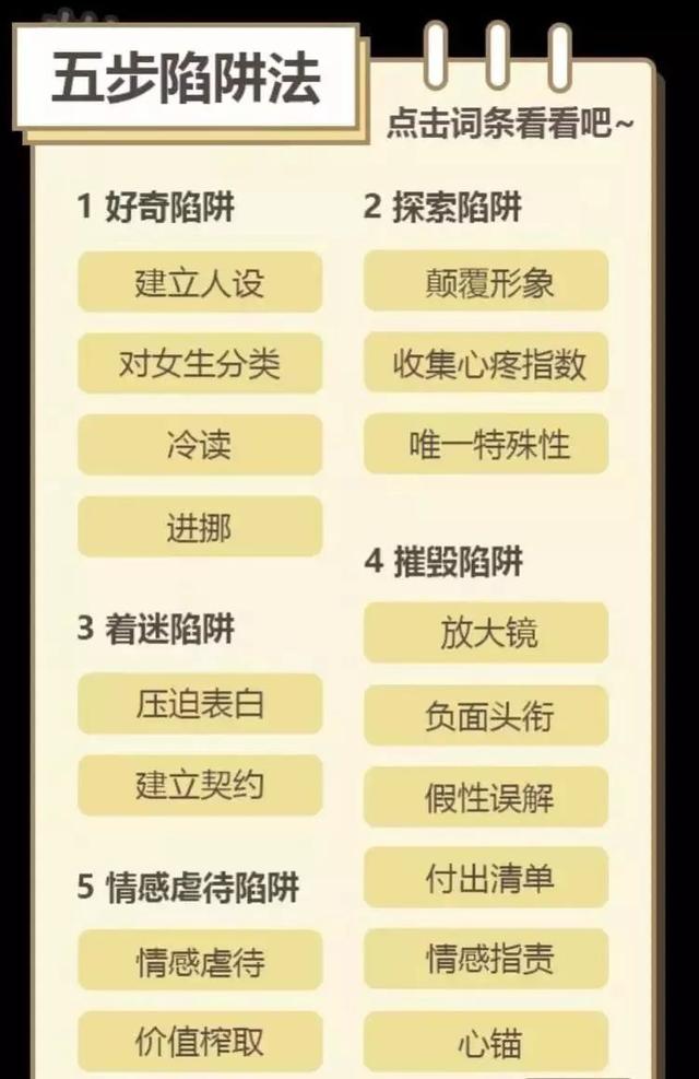 相关调查显示,PUA最常见的套路为“五步陷阱法”,即PUA学员与女性接触时的五层套路,从“好奇陷阱——探索陷阱——着迷陷阱——摧毁陷阱——情感虐待陷阱”层层推进,使目标逐渐沦陷。