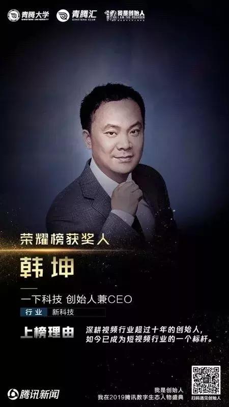2019腾讯数字生态人物颁奖盛典:一下科技创始人兼CEO韩坤 获“荣耀榜创始人”