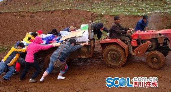 2009年志愿者在进收古村的路上推拖拉机上坡