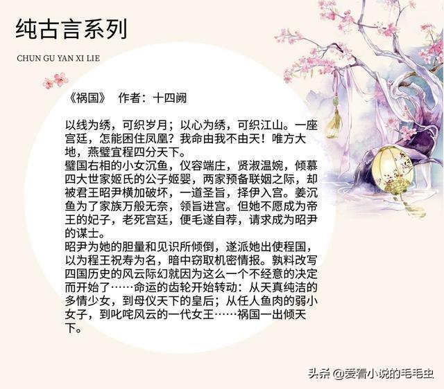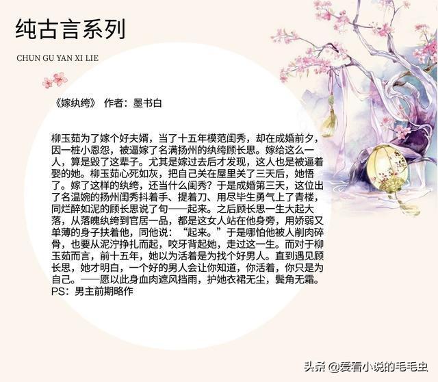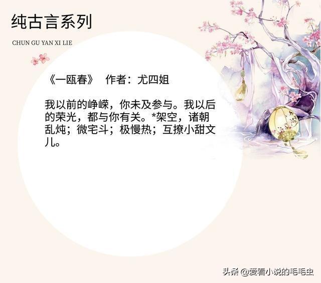大家好,我是毛毛虫,十年书龄小仙女,每天为大家推荐各种好看的言情小说。希望大家能够喜欢,喜欢的话可以分享给朋友,或者收藏起来。若大家有什么想看的书,可以在下方留言哦。本期整理的是5本不穿越不重生的纯古言小说,尤四姐《一瓯春》惊艳,值得收藏
