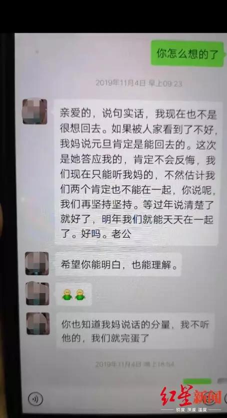 闫某某通过微信质问伏某为什么骗自己,明明回了通江老家还说没回。这时,伏某仍声称自己在广州上班,没回通江老家,希望自己回家后再说。