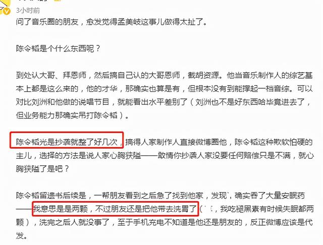 被前任曝出他劈腿孟美岐之后,陈令韬高调发文称自己要去结束生命,锤实了自己的劈腿行为,但同时也非常不负责任,面对错误各种逃避。后来有爆料称,陈令韬后来服食了两颗安眠药,被朋友带去洗胃了,人没事也算幸运,但他这么做给身边的朋友也增添了麻烦,还浪费了警力,也引发了网友的吐槽。