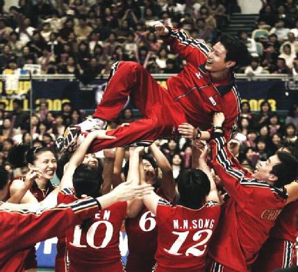 2003年第九届世界杯,以冯坤为队长的女排姑娘们以11场全胜的战绩夺回冠军。
