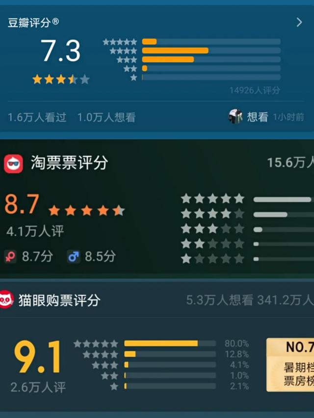 首先就是评分高,猫眼评分9.1,淘票票评分8.7,豆瓣评分7.3,作为一部动画冒险电影,它不仅特效做的十分逼真,可爱机灵的动画形象也让人的观影感受十分轻松解压。