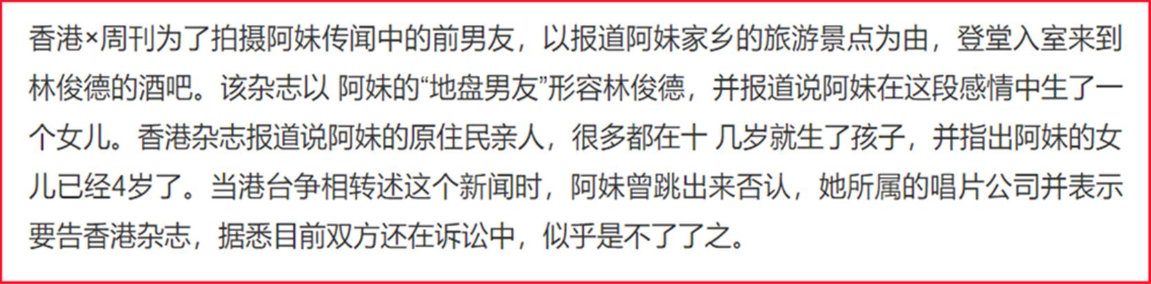 于是,不久之后便有媒体报道,阿妹15岁与初恋林俊德交往时,生下了一个女儿。多年之后,张惠妹生有一女这件事,时不时被媒体提及,成了她怎么也甩不掉的麻烦。