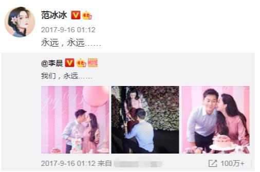 2017年甚至传来二人即将结婚的消息,李晨在范冰冰生日那天求婚成功,两人互相转发配文“永远永远……”。
