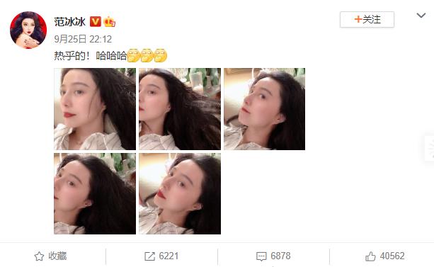 9月25日晚上十点多,范冰冰在个人社交平台上晒出最新的自拍,并发文称:“热乎的!哈哈哈”。