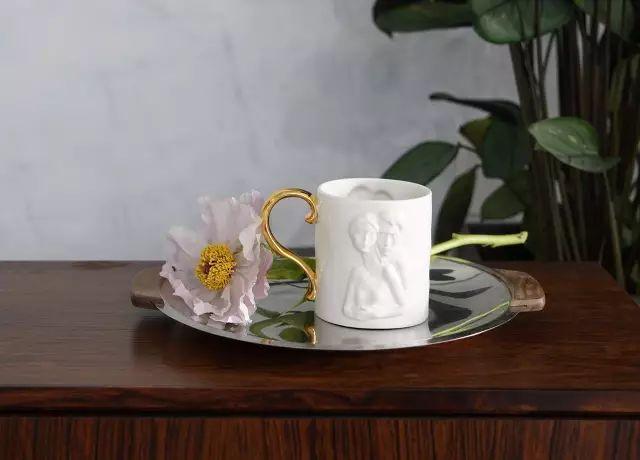 杯身由艺术家纯手工捏制,捏握时的触感高度平滑圆润且舒适,金色手柄则是用德国贺利氏金水(18K金) 手工喷制而成。