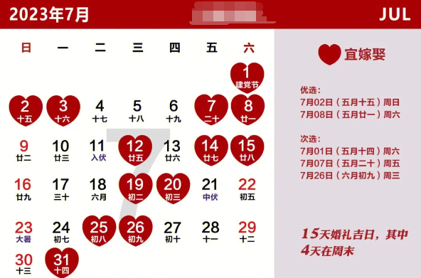 2023年7月是一个充满喜庆的月份,有很多适合领证或者举办婚礼的日子。在中国传统文化中,结婚是人生中最重要的事情之一,因此选择一个吉利的日子来举办婚礼或领证,对于新人来说是非常重要的。下面介绍几个值得注意的日子,希望对大家有所帮助。