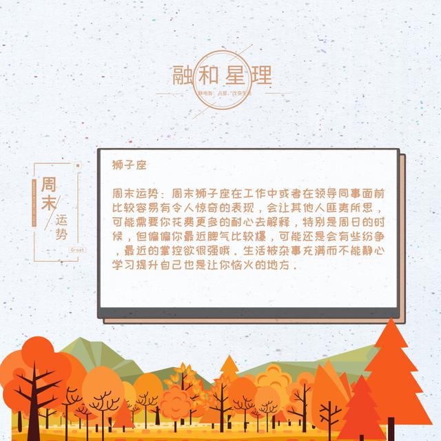 周末运势:周末狮子座在工作中或者在领导同事面前比较容易有令人惊奇的表现,会让其他人匪夷所思,可能需要你花费更多的耐心去解释,特别是周日的时候,但偏偏你最近脾气比较爆,可能还是会有些纷争,最近的掌控欲很强哦。生活被杂事充满而不能静心学习提升自己也是让你恼火的地方。