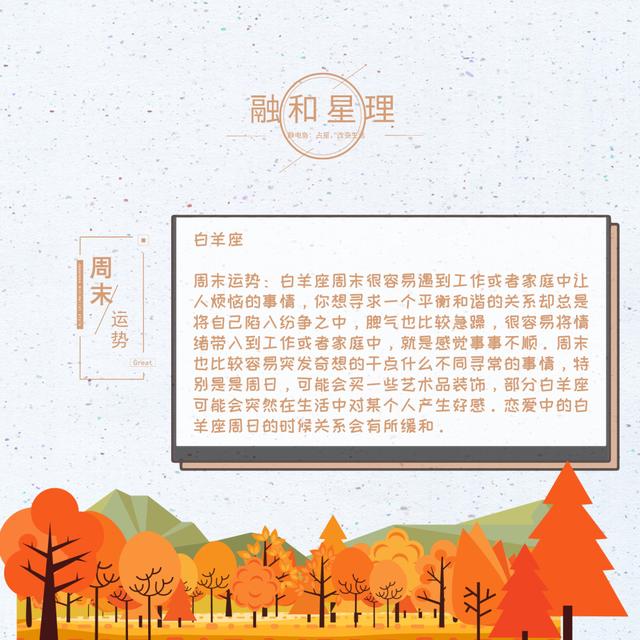 周末运势:白羊座周末很容易遇到工作或者家庭中让人烦恼的事情,你想寻求一个平衡和谐的关系却总是将自己陷入纷争之中,脾气也比较急躁,很容易将情绪带入到工作或者家庭中,就是感觉事事不顺。周末也比较容易突发奇想的干点什么不同寻常的事情,特别是是周日,可能会买一些艺术品装饰,部分白羊座可能会突然在生活中对某个人产生好感。恋爱中的白羊座周日的时候关系会有所缓和。
