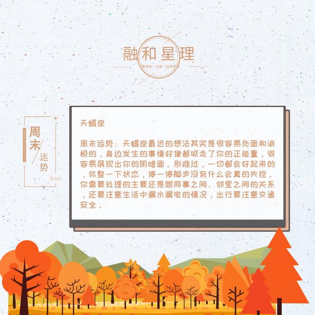周末运势:天蝎座最近的想法其实是很容易负面和消极的,身边发生的事情好像都吸走了你的正能量,很容易展现出你的阴暗面。别难过,一切都会好起来的,休整一下状态,停一停脚步没有什么会真的失控。你需要处理的主要还是跟同事之间、邻里之间的关系,还要注意生活中漏水漏电的情况,出行要注意交通安全。