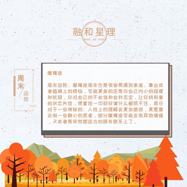 周末运势:摩羯座周末也是很容易遇到家庭、事业或者婚姻上的烦恼,可能更多的还是你自己内心的摇摆和犹疑,你对自己的不自信和自我否定,让你特别害怕状态失控,想掌控一切却好像什么都抓不住。周日对于一些神秘的、人性上的理解会更加透彻,更愿意去做一些静心的思考。部分摩羯座可能会有异地情缘,又或者是突然跟远方的朋友联系上了。