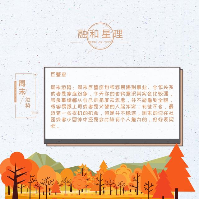 周末运势:周末巨蟹座也很容易遇到事业、合作关系或者是家庭纷争,今天你的自我意识其实会比较强,很多事情都从自己的角度去思考,并不能看到全貌,很容易跟上司或者是父辈的人起冲突,有些不合。最近有一些投机的机会,但是并不稳定,周末的你在社团或者小团体中还是会比较有个人魅力的,好好表现吧。