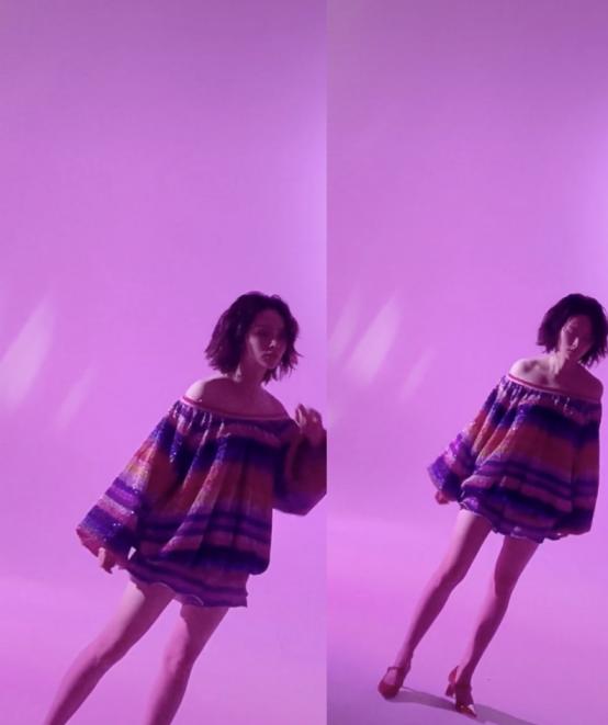 邓丽莎的第三套服装则是条纹套装的形式,看着还有点下衣失踪的味道,邓莎身穿的是一件提条纹泡泡形式的一字肩服装,服装蓬松的搭配当中,让邓莎的身材显得更加的清瘦了一些,加上一双红色的高跟鞋搭配之后,让邓莎的双腿看着更修长了,一点都不输给超模。