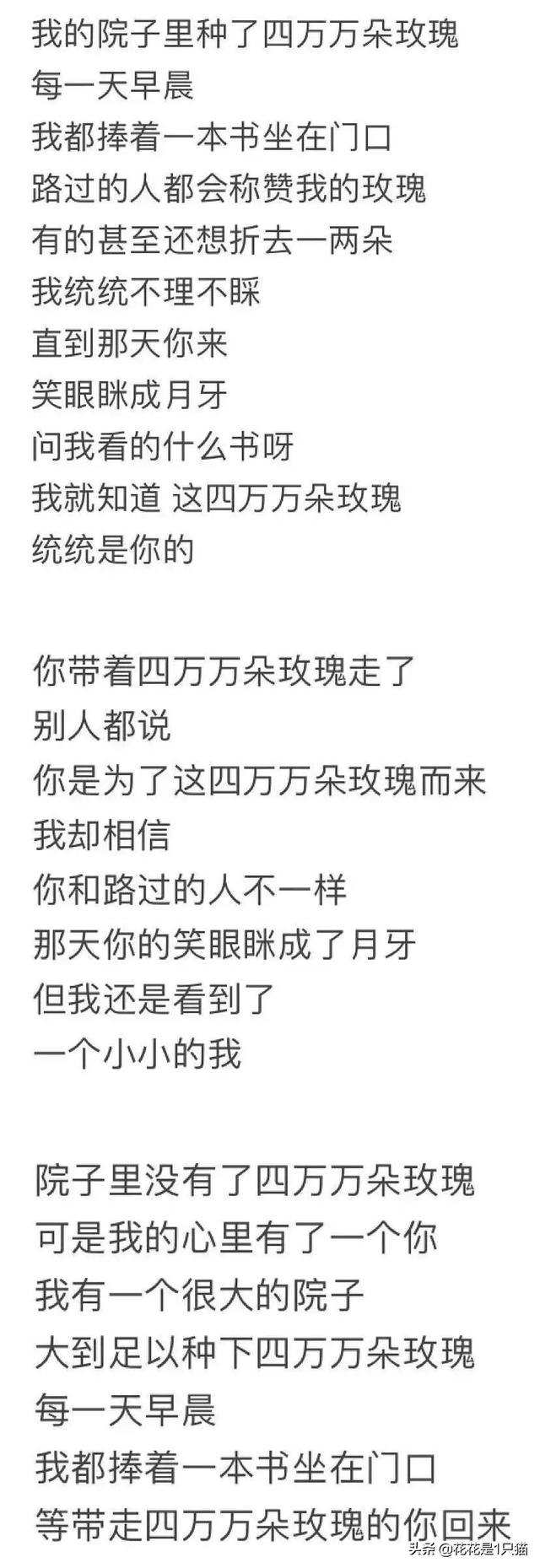 解读:我有很多花和大院子,来的人都想得到,让我感到不屑,直到一个与众不同的人出现,我发现自己找到了灵魂契合的另一半,于是心甘情愿送上所有。我以为你会留下,但其实你和别人没什么不同,带着我的全部还是离开了,但我愿意等,也愿意相信。