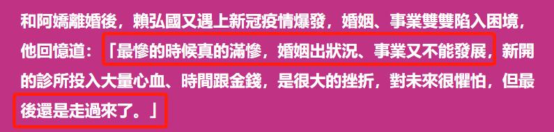 对比阿娇离婚后事业依旧风生水起,而赖弘国则因为刚刚开设的美容院遭遇疫情影响,导致很大挫折,毕竟当初投入大量时间、精力还贷款几百万开美容院,但却赶上疫情后医美事业也一度陷入低潮,再加上婚变差点破产,难怪赖弘国迟迟没能从前一段婚姻走出来。