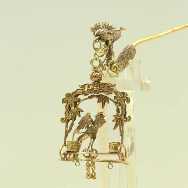 下左:清 凤鸟衔鹦鹉笼金簪