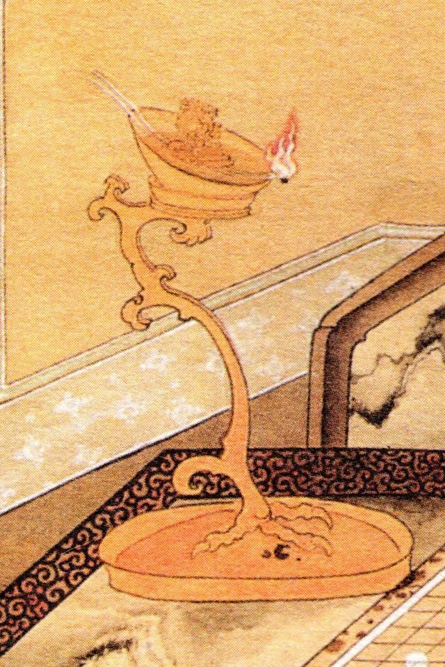 在清朝的这幅《闲敲棋子图》里,你可以发现她们是如何收集灯烬的,灯烬会一点点地落到下面的灯盘上,随时细心扫到小容器内即可。