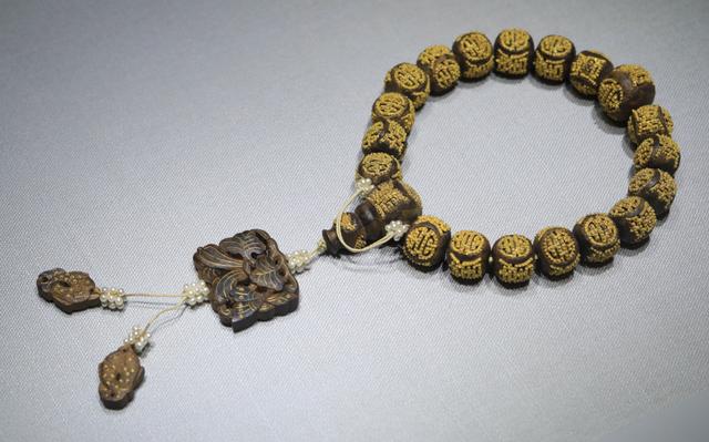 上:清 迦南香嵌金长圆寿字纹十八子手串