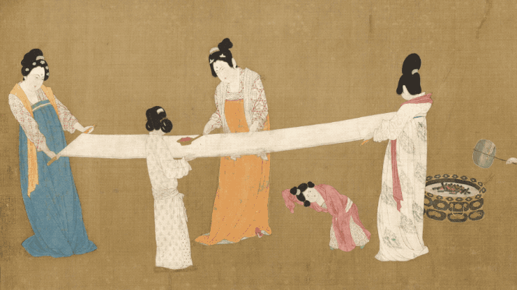 上:(传)唐 张萱 《捣练图》局部