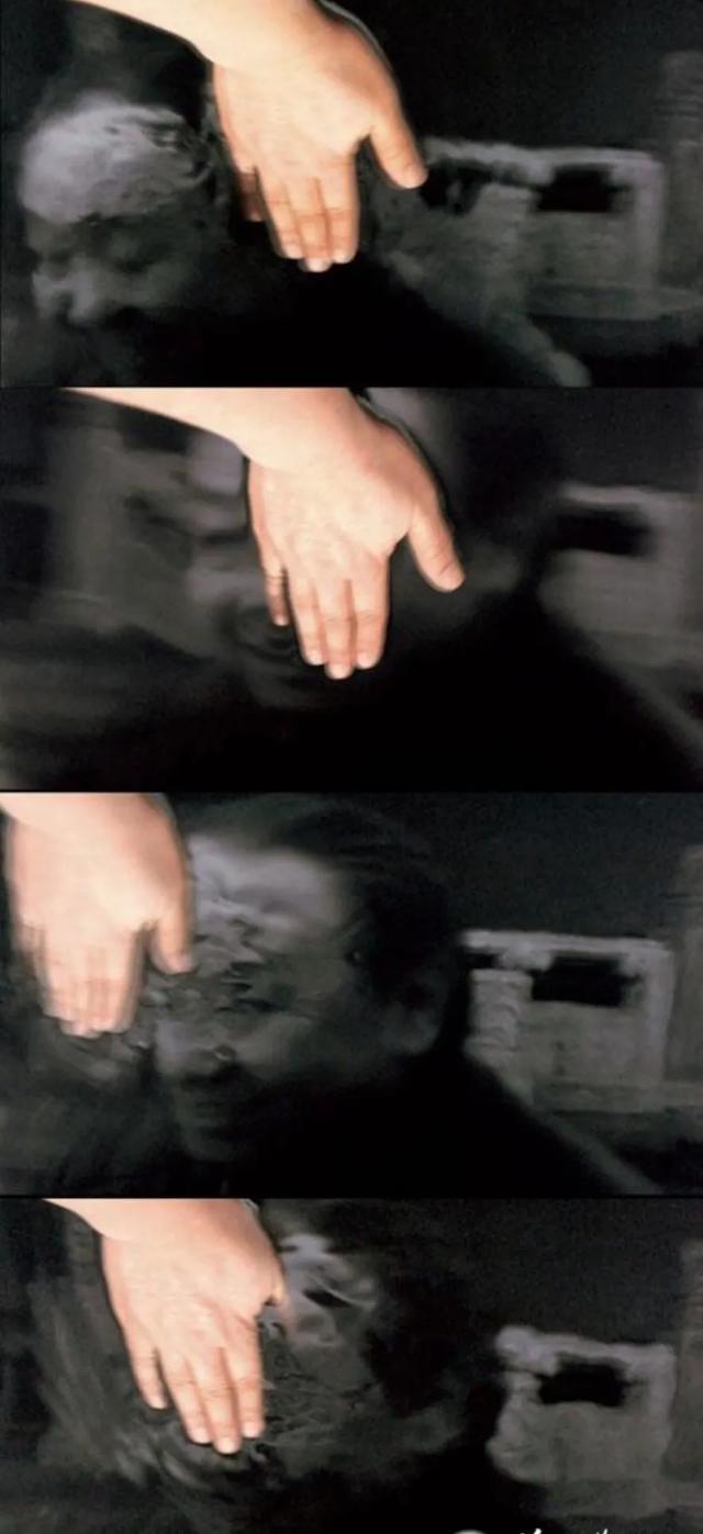 “抚摸父亲”这个项目一共有三部曲,在最后一部中,艺术家的父亲已然去世,作者将父亲的照片用影像投射到水上,用手去抚摸水面上倒影的父亲。