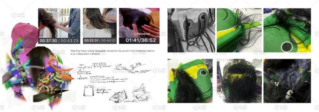 比如汉艺学员C同学,就是从小时候上学前,妈妈给她梳头发这件事的记忆出发,探索了孩子与父母之间距离感和独立的一种纠葛。总体视觉呈现方式是将假发缝进书包里,相对直接,也更有冲击力。