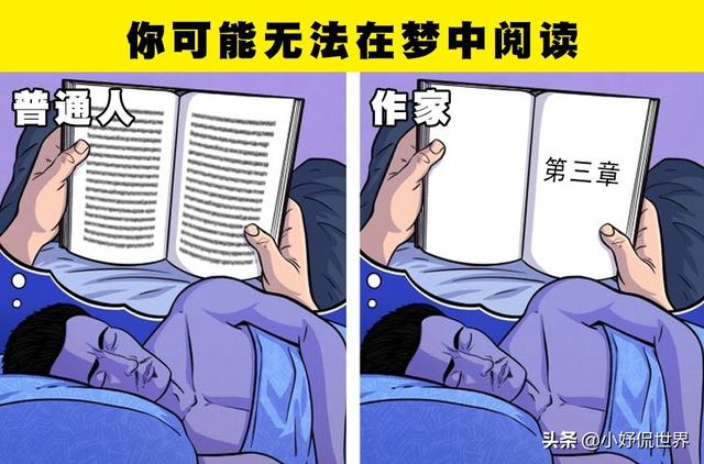 哈佛大学梦想专家、心理学助理教授迪尔德丽·巴瑞特声称,大多数做梦的人不仅失去了阅读能力,而且完全失去了语言能力。这是因为当我们睡觉时,大脑的整个语言区域都不太活跃,这使得在梦中阅读、写作甚至说话都非常罕见。不过,如果是那些经常与文字和写作相关的诗人和作家还是有可能在梦中进行阅读的。