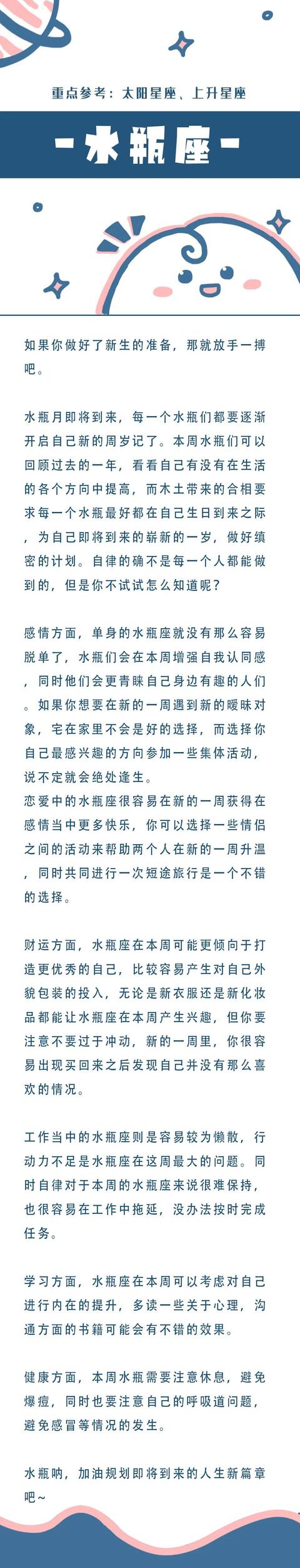 水瓶月的来临会让每个人都开始朝着自己独特的目标发起追求,会引导人努力做到自律,所以本周是可以好好努力的一周哦~
