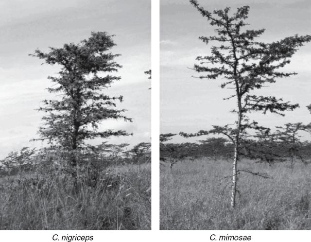 左边为被蚂蚁Crematogaster nigriceps占据的树,变得矮胖(图片来源:参考文献3)
