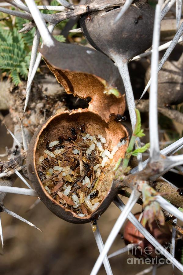 镰荚金合欢是当地四种蚂蚁争相占领的家,有三种蚂蚁(Crematogaster mimosae,Tetraponera penzigi,Crematogaster nigriceps)都选择与它共生,它们之间相互竞争,为霸占镰荚金合欢这个家而打斗。