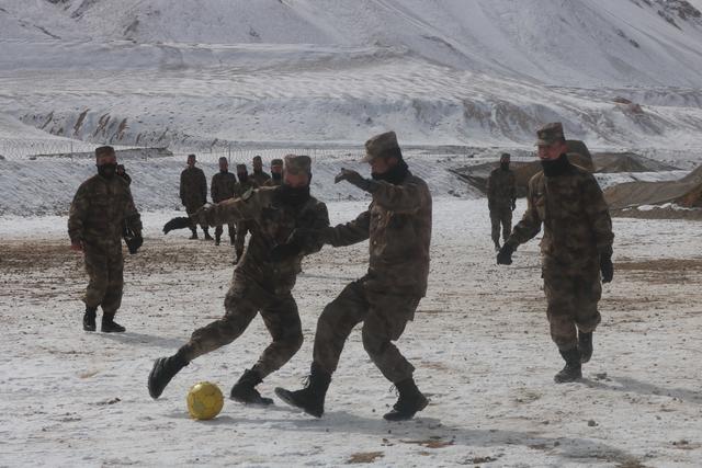 寒冬里最受欢迎的运动,莫过于雪地足球。他们在营院里平整出一方雪地,用雪作“草皮”,再找来废料焊接出两个球门。或许,这算得上是中国海拔最高的足球场了。