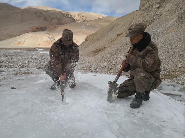 除了食物,水也是冬储的重要内容。距离连队最近的活水,在超过5厘米厚的冰层之下暗暗流动。
