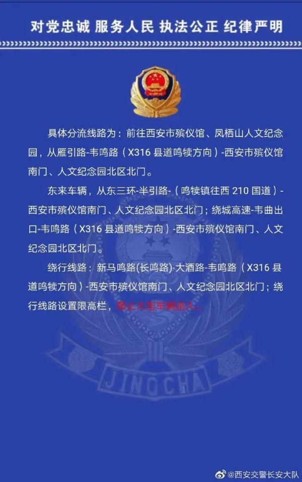 为确保清明节期间祭祀车辆通行畅通有序,请需前往西安市殡仪馆、凤栖山人文纪念园北区祭奠车辆提前规划好路线、择路绕行,绕行分流线路为: