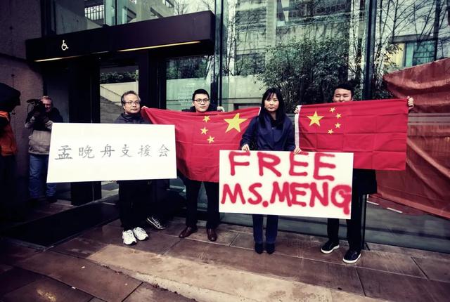 也有些民众,选择在法庭外举起横幅支持孟晚舟。