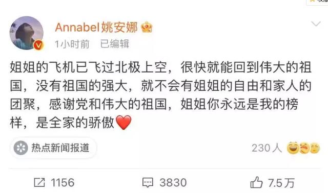 妹妹姚安娜在微博说,“姐姐的飞机已飞过北极上空,姐姐永远是我的榜样。”