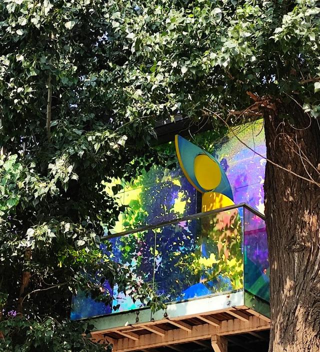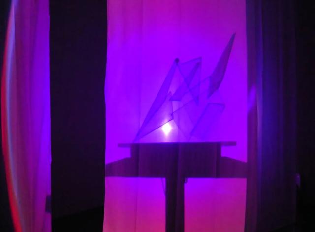 对“物”尊重的更高层次的认识便是对“物”的复杂性的承认与捍卫。当人们发觉主观的控制的无效性之后,对于“物”的运行所产生的适应与欣赏的态度也就顺理成章了。于是在艺术领域,“遭遇”和“神秘性”便成为了展现“物”之物性的两大途径。首先,这次展览的举办,除本人创作的这只“手”,也存在着没有预判的“上帝之手”的存在,即作品与展览最终的成果有相当比例的即兴与遭遇的成分。作品创作方面,虽然许多作品源于对标准几何体的切削,但切削的“刀形”、角度和尺寸等都没有提前定夺,而是在软件中反复尝试后,在某一时刻,作品突然呈现的样貌感染到本人,作品由此诞生。而展览现场的“遭遇”就更不胜枚举。例如第10号作品由于是夜间安装的,当时并没发现周遭的环境,第二天才看见了它身后的彩色玻璃,作品本身的蓝黄色彩与彩色玻璃一道,在阳光和树影之下展现出别样的色彩斑斓。(见图4)又如实验室中的第17号作品,本人原本希望借由透明的亚克力展现面的运动与空间层次,没想到背后的光线通过每个面的边沿后,在幕布上投射下深色的线条,轻质透明的由面搭建的作品在幕布上呈现出线框的交错,面与线意外地在实体与影像中转变。(见图5)而最令人惊喜的还是第11号作品吸顶的部分,原本的想法是“举重若轻”,即将这一组中体积更大的作品反重力呈现,凸显戏剧性的反差,但没想到重达120公斤的作品悬挂于龙骨后造成龙骨轻微形变,于是作品与天花板间产生了缝隙,并未完全吸顶,这反而赋予了作品意外的漂浮感,使得作品外部的轻盈与作品本身的沉重之间的对立更为激烈。而“遭遇”所带来的“出乎意料”则更推动了“神秘性”的展现,这种“神秘”不是深奥和激励求知的维度,而更多的是意外而后认同的维度。例如实验室的幕布将所有的三维作品转译成了二维剪影,这些图像随着作品在转台上的旋转而不断变幻,不仅因为剪影滤掉了体量上的细节,而只呈现出轮廓线的变动,观者在观察轮廓线时无法直接识别背后的三维物,而且由于缺乏参照物,单靠观察轮廓线的变化无法辨别顺时针或逆时针旋转,而只呈现出简谐运动的周期,这便更降低了作品被直接解读的可能性。而像第11号与第18号作品,立方体的每个立面都不尽相同,使得观者在面对作品的某一个立面之前,无法对其他立面作出判断,从而体现出神秘感,这种类似利西茨基的处理手法也是有效控制人性预判,凸显物性存在的重要途径。由此可见,作为艺术的创作者,由于有艺术取向的选择权,同时也是艺术“物性”的宣扬者,因此主动降低“透明度”便是艺术家对“物”的尊重的又一个典型动作。这也与前文提到的悬置所有既有条框息息相关,也与观者的亲身参与密切联系。