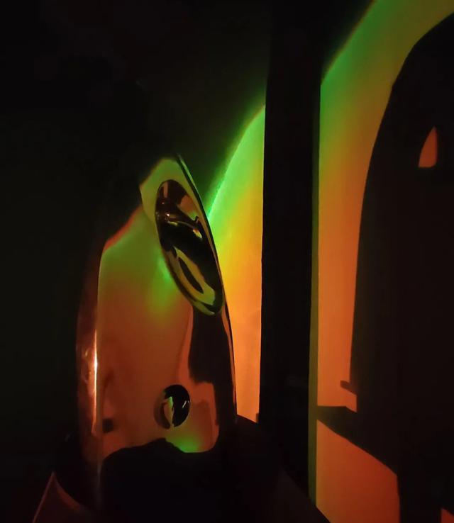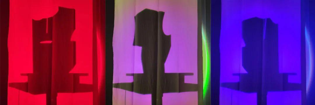 在批判主体性之余,物性理论更重要的价值观是对“物”本身的尊重,客观上对“物”广泛的接受就是其中典型的观点。“物派”艺术家认为所有的材料及其形态都是神圣的,都具有同等的艺术价值,因此本次展览中的第11、15、18号均为两个一组的正负形作品,它们来源于针对基本几何体的布尔运算,所产生的两个作品在空间中互补,互为图底,体量的推挤与空间的包裹也一一对应,这也被唐尧老师称作是“有形的空间”和“有空间的形”的辩证。与此同时,“物”还包括了基本的形式语言,例如第17号作品,本人就尝试用体和面的更换测试空间表现力,分别运用实体、面的包裹,以及面的解构这三种方式来塑造同一形体,在同样的物理尺寸之内,获得了视觉上从重到轻,从沉闷到通透的转变。此外,“物”还反映在材料层面,例如第12号作品为镜面不锈钢,通过反映周遭图像,不仅在视觉上接纳了语境,也在光线的反射中发散出自身的势能;而第17号作品的最末一件所采用的透明亚克力在光线的投射下呈现出面与面相互掩映的层叠感,在体量更显轻盈之余,还收获了从体量到空间的转变。不仅是有形的物体,无形的“物”如色彩、光影,甚至旋转、抖动、上升、下降等运动都具有其动人的物性,如实验室(见图3)中设定的彩色灯光以及白色透光幕布,便可重塑作品的性格;而门厅处的2号作品,由旋转所造就的内外圆圈的纠缠,以及给立入其中的观者所带来的晕眩感,都是这些无形的“物”所一手缔造的。